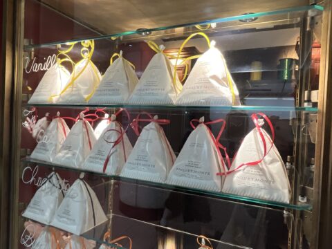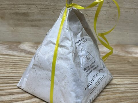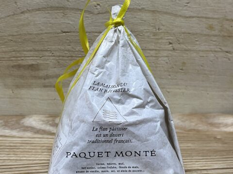 PAQUET MONTÉを代表するのが、フランスの伝統菓子「フラン・パティシエ(Flan Pâtissier)」。カスタードをたっぷり詰めて焼き上げたタルトのようなお菓子で、外はパリッと香ばしく、中はとろりとなめらか。多層の筒状パイ生地を焼き上げ、仕立てたフラン液を注ぎ、もう一度焼成させて…と、一つ一つ丁寧に作られています。お店の定番はフラン・パティシエのバニラ。その他、季節限定や店舗限定で展開される抹茶やチョコ、イチジクやラズベリーなどのフランもあり、訪れるたびに様々な味を楽しめる仕様になっています。そしてとってもかわいい、紙と紐のみで包むピラミッド型のパケモンテ。パケモンテ(PAQUET MONTÉ)とは、フランス語で「パケ(包み)」「モンテ(山)」を組み合わせた言葉だそうで、フランスの伝統的な三角包み(紙と紐のみで包む)のこと。シンプルなのに洗練されていて、見た瞬間に特別感が伝わる包み方です。誰かに贈りたくなるかわいさですね。
