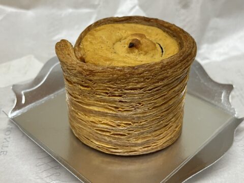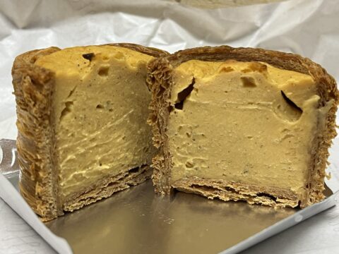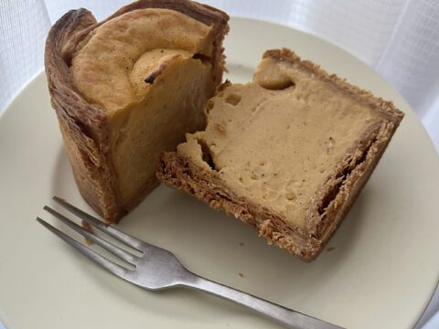 フランスの伝統菓子「フラン・パティシエ」は、見た目こそシンプルですが職人の技と素材の力がぎゅっと詰まっています。表面は焼き色がしっかりとつき、中のカスタードはなめらかでしっとり、バニラビーンズが効いたカスタードプリンのような食感と食べ心地です。土台の生地にはほんのり塩気が効いているから、濃厚なカスタードとのバランスが絶妙です。軽くリベイクして食べると、周りのパイ生地がサクサク!焼き立てのような香ばしい味わいが楽しめます。逆に冷やして食べると、パイ生地はしっとりとしてカスタードはなめらか。塩味がより感じられ、カスタードの味が引き立ちます。カリサクッとしたパイが好きならリベイク、ケーキのようにひんやりスイーツとして味わいたいのなら冷やして、がおすすめです。フランスでは温度と食感の違いを楽しみながら食べるのがポイントなのだそうですよ。半分に切って食べ比べても楽しいかもしれません。