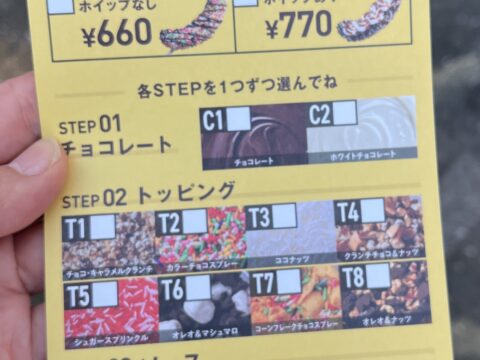 注文は、初めに店員さんからオーダーシートをもらいます。ホイップのありなし(ホイップありだと少しリッチに)、コーティングチョコ(白か黒かベースのチョコレート)、トッピングの種類(コーンフレーク、マシュマロ、オレオ、チョコスプレーなど)、ソース(チョコソース、ストロベリーソース、キャラメルソースなど)を選んで1つずつ☑を記入します。店員さんにオーダーシートを渡すと、目の前で大きなバナナに手際よくトッピングしてくれて、かわいいチョコバナナの出来上がり!トレーに乗せられたビッグサイズの盛り盛りチョコバナナは、とっても豪華。片手で持つとずっしり重く感じます。
