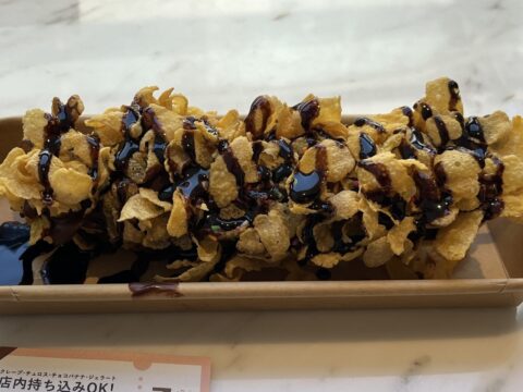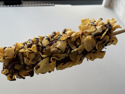 黒チョコ、カラフルスプレー、コーンフレーク、チョコソースをトッピングしたチョコバナナ。”ホイップなし”バージョンだとチョコのカリッとした食感や、 バナナの柔らかさのメリハリがダイレクトに味わえて、とってもおいしい!映え×パフェ風に味わいたい時は、”ホイップあり”がボリュームもあっておすすめ。トッピングによってチョコバナナの見た目や味わいがかわるので、色々と試してみたくなります。