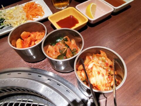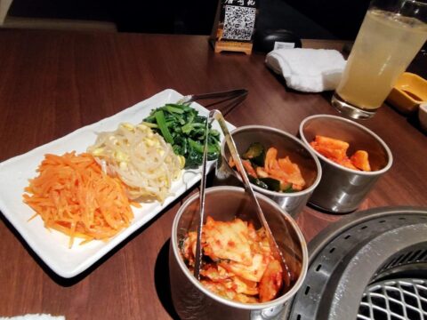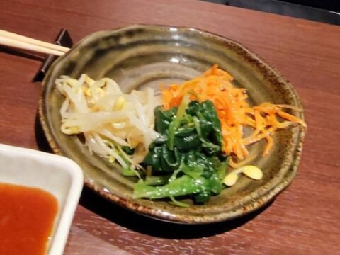 まず、キムチ(長いも・きゅうり・白菜)3種とナムル(ほうれん草、もやし、にんじん) 3種が運ばれてきました。味付けは辛すぎず、まろやかな味で箸が進みます。