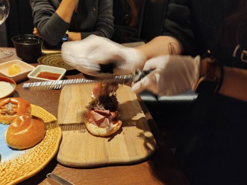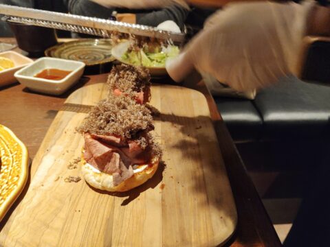 バンズの上にサワークリームとローストビーフを乗せ、「これでもか」というくらいトリュフをスライサーでこんもりと山盛りにし、ソースをかけ、バンズを乗せて完成です♪