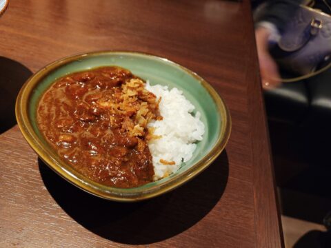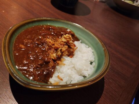 カレーライスはスパイシーだけれど、優しい味わいで、お肉を食べた後でも美味しくいただけました。使用しているお肉は、希少部位をひき肉にしたもので、スパイスはお店のオリジナルスパイスらしいです。