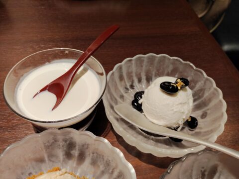 コーヒーゼリー、黒豆ミルクアイス、マロンアイス、ミックスベリーシャーベットの4種類のデザートから好きなものを選びます。